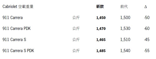 在 911 敞篷車型方面,保時捷也同樣成功逆轉了重量的指針,打造出重量比前代車型大幅減輕的新款 Cabrio 車型;視裝備而定,車重減少多達 60 公斤。因此在相同的引擎輸出下,新一代的911 Carrera 可實現油耗顯著降低的強勁性能 – 一言以蔽之,便是「保時捷智慧性能」。