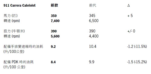 911 Carrera Cabriolet 3.4 升水平對臥引擎,最大馬力 350 匹 (257 千瓦);後輪驅動、七速手排變速箱,可選配七速 Porsche-Doppelkupplungsgetriebe (PDK) 雙離合器自手排變速箱;從靜止加速至時速 100 公里僅需 5 秒,配備 PDK 時僅需4.8 秒 (搭配跑車計時套件時為 4.6 秒);極速為每小時 286 公里,配備PDK 時極速可達每小時 284 公里;平均油耗 (NEDC) 為 9.2 升/100 公里,二氧化碳排放量為 217 克/公里;配備 PDK 時油耗為 8.4 升/100 公里,二氧化碳排放量為 198 克/公里。