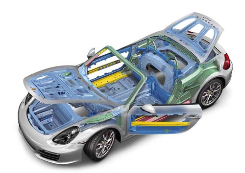 對於跑車來說,性能的最大天敵就是重量,Porsche深明此一道理,因此在新一代Boxster開發初期,降低重量就成為首要的工作,而受限於更嚴苛的安全法規與靜態的抗扭曲性目標,若是Boxster以傳統鋼製車身就非得增加重量不可,從新一代911開始採用的鋼鋁複合結構就展現出優勢,尤其是在重量方面。Boxster當然也採用這項設計,車體結構有超過46%的部分以鋁合金製作,大幅降低了車架的重量,全新的結構也提高靜態抗扭曲性達40%,而另一項附加的優點則是車身中心也因此降低了6mm。 |