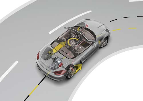 | PTV扭力分導系統 PTV扭力分導系統是Boxster的選用配備,它可藉著單一啟動後軸內側煞車並將更多的扭力提供給外側後輪,藉此製造出橫擺力矩,藉此輔助車輛過彎,而整個動作是在車輛開始進彎之前就已經預做準備,在開始轉動方向盤時同步介入動力分配,如果搭配選用的Power Steering Plus,更能顯著提高動態靈敏性。 PTV扭力分導系統除了控制煞車之外,還包含電子控制的機械式限滑差速器,此一機械式限滑差速器的鎖定比例為牽引時22%、推進時27%。 |