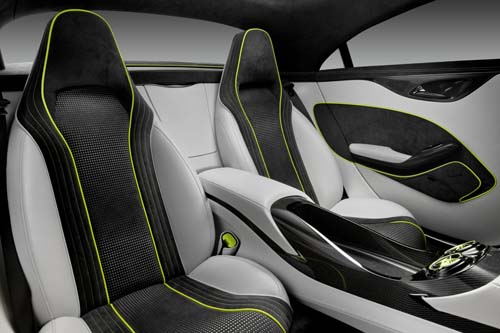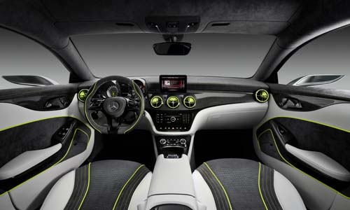 打開車門,迎面而來的是與A、B-Class相當類似,具有高度量產成熟度且讓人感到極為熟悉的座艙基礎鋪陳。但不同於A、B-Class的成本售價考量,身為僅此一部概念車身分的Concept Style Coupe,則是大手筆的在中控檯表面與座艙內部用上大量的麂皮包覆,包含雙潛望鏡式樣儀錶組的外框、中控檯與前後中央鞍座以及車門內扶手……等,也可見到大面積的碳纖維飾板身影。搭配類似噴射機引擎造型、可隨溫度變色的空調出風口,與4具獨立跑車座椅的配置,營造出極為動感的高性能氛圍。