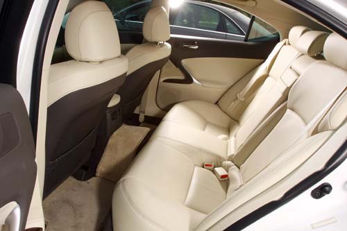 單就車身尺碼來看,IS250所擁有的是4車中最小的4575mm車長與2730mm軸距長度,實際反映在座艙空間的表現上,果然也完全呼應此項特點,無論是座艙或是行李廂空間表現都在4車當中居於最末位。一進入IS250的座艙即可明顯感受到原廠所刻意塑造出來的動感風格,窗戶玻璃面積也比其他3車狹隘許多。前座的空間感受雖與其他3款車型相差無幾,但後座空間表現則是明顯小上一號,不僅後座乘坐長度是4車最小的70cm,實測的後座膝部空間表現也以1.4個拳頭居末,至於後座頭部空間也受到下切的C柱與後檔造型所影響,僅有大約2指幅的堪用程度,後座乘員所擁有的是4車當中最明顯的空間壓迫感。至於行李廂空間表現同樣也非IS250的重點所在,不僅缺乏類似A4所提供的後座分離式椅背傾倒功能,後軸的懸吊結構也佔掉行李廂內兩側頗大的一部分空間,而398L的行李廂標準容積為4車最小,載物空間的平整度也還有改善空間。