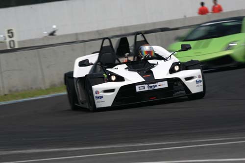 3月25日活動當天除了上演國內難得一見驚險而刺激的O.T.G.P.爭先賽與各組單圈獨走賽之外,為了持續推廣國內改裝店家投入由Option在大鵬灣國際賽道所舉辦的單圈挑戰賽,這回特別在中午時段中安排一場示範表演,藉由G-Motor周伯雄所駕駛的Lamborghini LP570加上Team VP Racing Taiwan林帛亨駕駛KTM合力進行表演,由於單圈計時挑戰賽除了需要改裝店家與專業車手結合,針對輪胎方面最高使用等級限制也僅為有紋熱熔胎,在有限抓地力條件下以符合World Time Attack的活動精神。首先由林帛亨所駕駛的KTM是採用Toyo R888有紋熱熔胎,在GIAC 370hp動力輸出配上725kg的車重重量馬力比極具優勢,雖然受限於R888胎溫變化因素最終成績僅能跑出1:54秒,不過未來仍將會進行胎圈設定,目標將單圈成績突破至1:53秒。