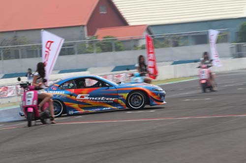 | 相較於以往四輪甩尾演出,這次特別改用兩輪AEON宏佳騰機車,加上周伯雄駕駛S15精湛的甩尾順勢將中場氣氛炒熱到最高點。 |