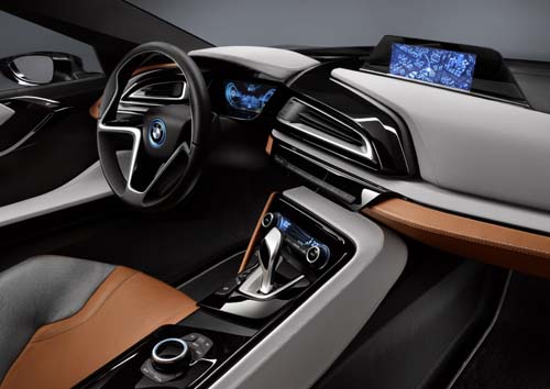 原廠也趁著i8 Concept Spyder的推出,公佈有關於車身規格及Hybrid油電混合動力的部分細節。實際上從最早的Vision EfficientDynamics Concept到後來的i8 Concept,已確定這部車會使用碳纖塑料材質所製作,藉此將車身重量的負荷降到最低程度,而這方面由於BMW已投入大筆預算建構製造碳纖維的工廠與量產技術,產製i3與i8已不是問題。當然,概念階段的一些誇張造型在最後勢必會隨著量產的需求而逐漸轉為符合商業化的設計,而i8 Concept Spyder的現身當然也透露出些許端倪,其內裝的中控檯架構與iDrive介面與現行車款已非常雷同,但8.8吋的螢幕已用上現今最新的3D顯像技術,動力系統也比照現行的Sport與EcoPro模式,可同時符合運動化與經濟面的要求,再來大家所注意的焦點就是隱藏在車殼底下的動力系統。