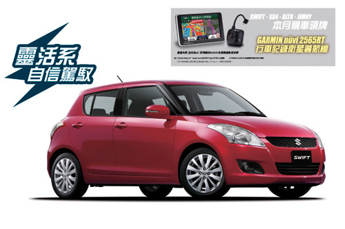 台灣SUZUKI再掀送”機”風潮,價值萬元GARMIN NUVI2565 RT行車紀錄衛星導航機送給凡於6月份領牌SUZUKI旗下車款“靈活系SWIFT、熱血系SX4 、越野系JIMNY、風潮系ALTO就可獲得。此款行車紀錄衛星導航機組合好處多多、不但能帶你遊山玩水也能同時錄下行車狀況,數量有限送完為止。另外SUZUKI夏季冷氣健檢活動持續發燒中,於2012年5月15日至2012年6月30日為止,還沒為愛車健檢的車主們,6月底前把握機會。