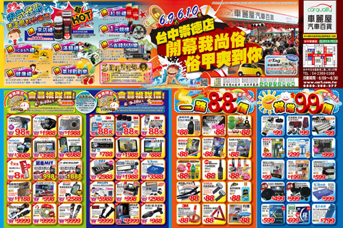●會員排隊價商品:6月9日10日兩天的上午、下午都有排隊價活動,眾多不可思議的超低特價商品等著你搶購,像是愛鐵強油精竟然只要8元,行車紀錄器也是100元還有找,其他特賣商品還包含具備USB/SD雙讀取功能的汽車音響主機只要788元,Gonav衛星導航只要888元,185 65 14的國產輪胎只要998元,CZP HID只要998元,超級電匠電源供應器只要1188元,還在等什麼,趕快來排隊A好康囉