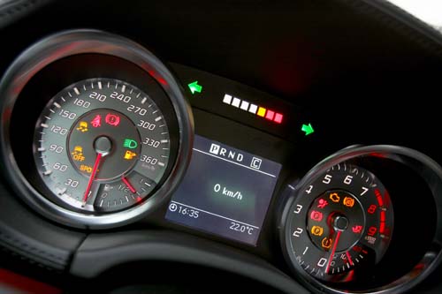 | 雙潛望鏡式樣儀表組與中央液晶螢幕擁有出色的視覺辨識效果,上方七顆白、黃、紅色LED超轉指示燈,與方向盤後方的鋁質換檔撥片設計,更可提供豐富的駕馭樂趣。 |