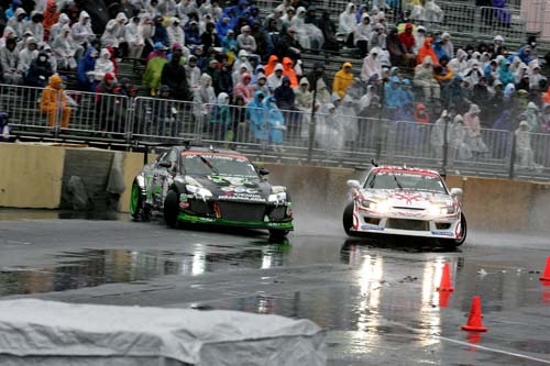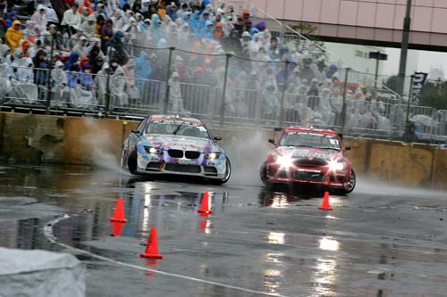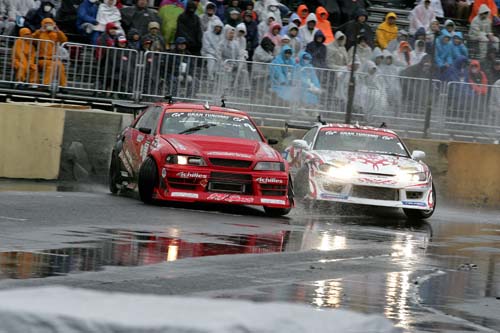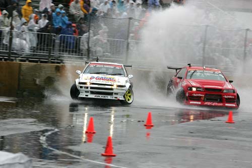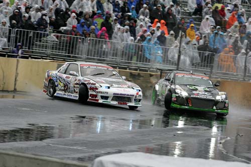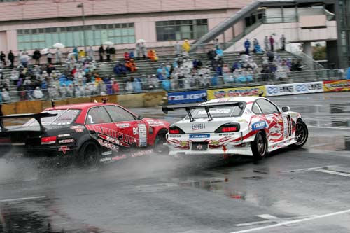 | PK1(Best16) 上野高廣E92 vs 谷口信輝SXE10 2JZ名機對決 16強PK決賽中上野高廣與谷口信輝對戰,可視為是2JZ-GTE引擎動力的對決,雖然前者近千匹的調校出力仍大過後者的六百匹,但今天的雨勢溼地卻增加了變數。經過一輪PK後評審認為勝負50:50,決定來場Sudden death延長賽。谷口終因過於謹慎怕車輛壓過積水失控,使得入彎速度與滑移角度不如上野而不幸敗北。 |