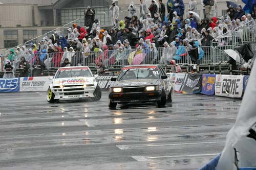 | PK5(四強Semi-Final) 齊藤太吾JZX100 vs松川和也AE85 大、小馬力難得對決 這兩部車的對決光是馬力可能就先差了將近一倍!不過今天下雨誰有優勢還很難說,尤其台場站屬中低速型小彎賽道,所以看起來AE85一點也不遜色。而實際在決賽過程中,兩人果真拼鬥難分高下,經由延長賽齊藤太吾才因驚人的高速魄力入彎不斷逼近松川和也而獲得勝利! |