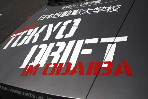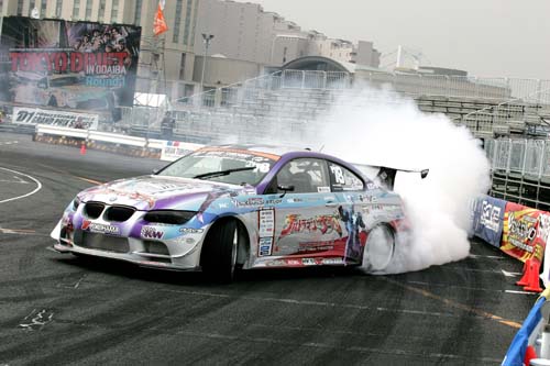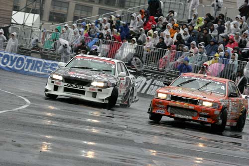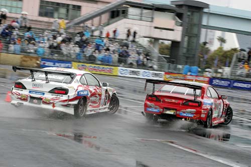 住在台場區飯店的筆者,星期六一早起床見到大雨天候就知道今天比賽辛苦了,不僅幫自己買了雨傘、雨衣,也順便幫相機DIY做了一件臨時雨衣。原本以為雨天比D1可能很無聊(少了濃煙、車速也較慢),但實際來到比賽場地後才發現並非如此。原因在於比賽路段中遍布積水,當車手以高速掃過積水時所濺起的水花相當驚人,再加上天雨路滑導致不少車手紛紛出現Spin碰撞,儘管氣溫僅攝氏10度,但賽事卻依舊熱鬧高潮不斷。由於D1賽事今年開始預賽單走順位前20名即有年度車手積分可拿(20、19、18…依次遞減),所以選手必須想盡辦法在單走階段做出最理想的排位,但仍只有前16強能夠進入決賽雙車追走階段。