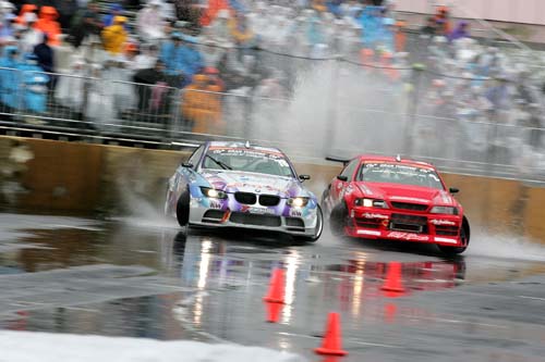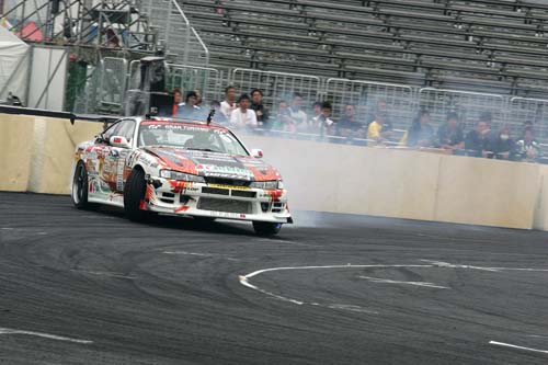| 下雨天的台場D1甩尾賽可說是一點也不無聊,光看這些千匹緊繃廠車打水漂就很過癮了! |