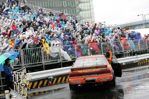 | 儘管現場下著大雨,數千名日本D1車迷還是穿著雨衣替喜愛的車手們加油! |