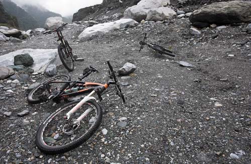 回到停放單車的地點,心情放鬆許多,基本上回程都是下坡,只是溪床上的坡度比一般林道和緩多了,但是有些路段騎乘在較鬆軟的沙石上,其實阻力相當大,所以來時騎得非常吃力,回程時雖然輕鬆但速度也快不起來。但只要通過沙土路況,仍能獲得一定的速度,其中有幾段碎石陡下坡衝下去相當過癮,雖然跳動不已但是坡底為平緩細碎沙石地面,所以可以放心的不減速衝下去,順便測試輪胎的抓地力以及車身的穩定度。在這樣的路況當車速最快時直接煞死後輪,若身體重心不偏移的話,基本上都還能夠直線前進。由於溪床的視野開闊,下坡的滑行較為放心,所以很快的就回到了起點。若以西林村為起點的話,這條溪床上的單車行程其實以一整天來玩相當適合。