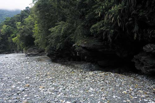 | 岩壁下方的凹入處,並非洞穴,而是溪床沙石堆積的結果。 |