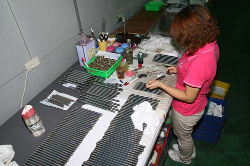 | 每一支即將組裝完成的避震器,還要進行最後的品管檢查才能開始裝箱。 |