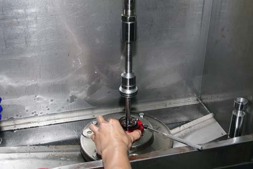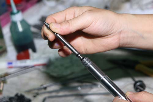 | 組裝人員手上拿的便是用來調整減震筒阻尼軟硬的機構,這部份該廠也有獨家油封技術,可防止阻尼油從該機構中洩露出來,影響減震筒壽命。 |