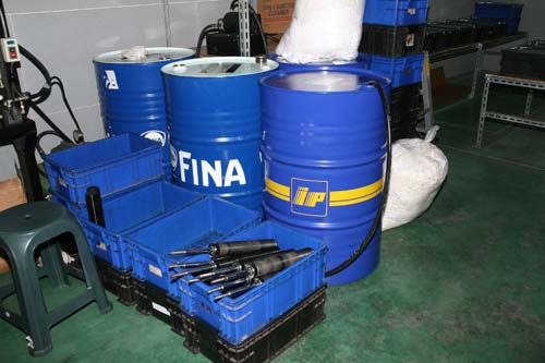 | 組裝人員正在填充阻尼油,該廠使用的阻尼油大致上可分成,街車版型號使用IP-5W、運動版使用IP-20W、競技版使用Fina-40W的阻尼油,愈往後者阻尼反應愈硬,才能應付激烈的賽事所需。 |