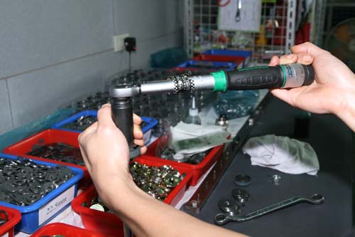 | 為確保每個組裝動作都能符合規範,該廠也設立許多SOP的組裝流程與工具,例如:專用油壓迫緊機台,或扭力板手等,協助組裝人員每個動作都能確實到位,維持每組產品品質。 |