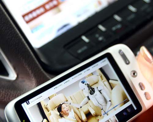 | 藉由與智慧型HTC手機與Think+Touch系統的連結,可將手機上所有的功能投影至9吋的觸控螢幕上。 |