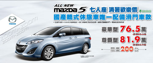 而為了滿足暑假家庭用車的購車換車需求,MAZDA也特別推出「All New Mazda5消暑歡樂價」,提供All New Mazda5七人座豪華型76.5萬元(原價82.5萬元)、尊爵型81.9萬元(原價85.9萬元)的超值限量優惠,最高降幅達到6萬元(一共限量200台)。不論是Mazda3或Mazda5的限時限量優惠專案,只要消費者在本月底前領牌,一樣可以搭配MAZDA「最大賞」,把車價優惠再加上「最大賞」(免利息、免工資、免油錢、免保費、免稅金)等購車優惠,實際優惠幅度可逼近10萬元之譜!堪稱國產車史上最大的降價優惠幅度!請消費者萬切莫錯過入主最佳運動跑房車Mazda3、國產轎式休旅標竿All New Mazda5的最佳良機!