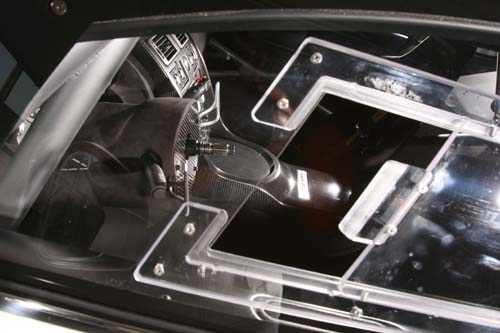 | 後行李廂的陳設再次突顯工廠賽車縝密的規劃與細膩手法,防爆油箱、汽油泵浦與快速加油管路均隱藏在鋁合金護板內。 |