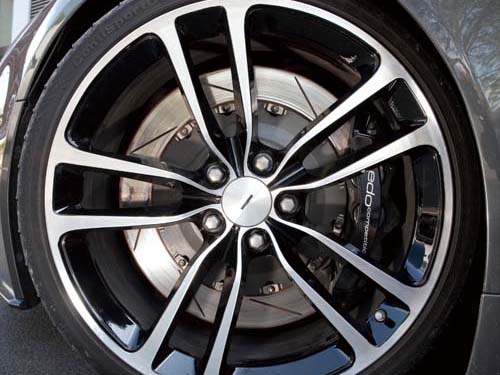 | edo competition為DB9推出強大煞車系統,前輪改裝對向六活塞卡鉗搭配405mm碟盤,浮動式設計更能對應高速煞停所需 |
