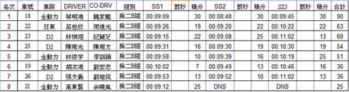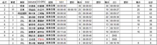 | 黃彥愷在SS3計時點前一個彎撞到,接著硬開通過計時點後車輛便無法動彈,但所做出的成績是當回合該組最速。 |