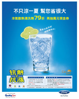 擔心車內冷氣不夠涼無法抵抗夏日豔陽嗎?Ford 專業服務廠QualityCare推出「不只涼一下,幫您省很大」定保車主獨享夏季優惠活動,包括免費替愛車作冷氣系統健檢,針對風扇運轉、壓縮機運轉、冷媒高低壓和冷凝器作全面性的檢測,並提供免費車內臭氧負離子空氣清淨及車外清潔等服務。車主在等待愛車接受檢測保養時,也可以享受免費的WiFi無線上網服務。更值得一提的是,車主如果回廠為愛車作定期保養,即有機會抽中萬元現金券,可於半年內回原服務廠折抵商品、維修和保養服務。