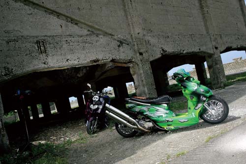 這兩輛車是以速可達界中最夯的勁戰最為原車型下去施以進化,而「綠巨人號」及「死神號」就是出自於V.I.P Moto Club阿傑的巧手,阿傑與一般店東相同,年輕時就是以學徒開始做起,一開始則是在知名店家學習引擎的提昇開始,也因此累積許多最基本的專業技術,就在兩年半前才自行開業,將原本所學的部分再度施以衍生,而對於動力改裝來說,雖然是阿傑基本功的來源,不過外觀系的改裝才是阿傑想要與眾多店家區分開來的主因,目前店內基本上都是以外觀系為主,並且採客製化方式。