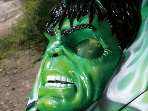 以綠巨人號來說,在著手改裝前就是以外觀系為主,而一般路上或是賽道都可看到的外觀彩繪都是以平面為主,就算再怎麼與眾不同也只是「圖案」上的差別而已,因此可觸碰得到,跨越平面2D彩繪的念頭就此誕生,不管是綠巨人號還是死神號,車頭的臉孔則是以購入角色扮演常用整套面具含服裝的產品,而實際用得到就只有面臉孔部分,在核對必須固定在車輛位置後,為了考慮到強度問題,面具內部必須先以纖維補滿再來固定在車身上,最後再施以烤漆及周邊的平面彩繪後方可大功告成。