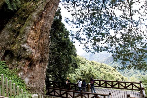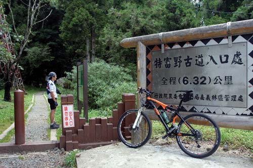 夏季的天氣型態總是上午艷陽高照氣溫炎熱,午後容易有雷陣雨,這次的行程中也是如此。我們的單車與背包在阿里山森林遊樂區的門口前組裝好之後,便往塔塔加的方向出發,這段路程約21公里,全程為和緩的上坡,一路騎來輕鬆愉快。但是一開始不久便開始下雨,而且雨勢不小,儘管已經穿上輕薄的高檔風雨衣,但仍然感到悶熱,汗水還來不及排出,就已讓身體溼透了。索性雨衣脫下不穿吧,這樣舒服些,而當我們抵達舊的自忠管制站前雨勢便停止。雨後讓空氣變得更清新,此地有一家花團錦簇的民宿咖啡在此營業,在此喝杯咖啡休息視野景觀超讚,相信經過的人都會停下來休息。對面還有一條特富野林道的指示牌,林道入口就在指示牌後方,這是一條平易近人的小林道,全程皆有完善的指標導引,也是一條值得一遊的路線。21公里的距離爬昇三百多公尺其實很輕鬆,慢慢往上踩只要半天便可騎完全程。