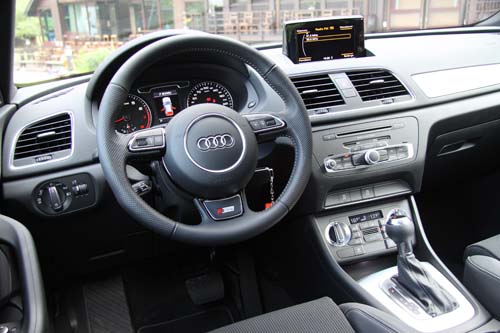 相較於外觀的動感造型,似乎在內裝空間的配置手法更令筆者喜愛,雖然車身尺碼僅只有4385×1831×1608mm與2603mm底盤軸距,但是在挑高的座艙設計下使得乘坐感與視野表現上,不僅能有效提供四名成人乘坐時的舒適感,就連後座膝部與頭部空間也足以滿足身高近180cm身高的成人。配合460公升的行李箱置物空間,在後座椅背無須往前傾的條件下即可輕鬆置放三件大型行李箱,若是搭配後座6/4分離式座椅之後,最大承載空間可達1365公升,除了缺少平整化載運空間的缺憾之外,其表現似乎完全不遜色於傳統五門掀背旅行車。至於強調年輕化車款的Audi Q3,其內裝與操控介面除了以駕駛者為中心,簡潔的影音與空調旋鈕設計,另外搭配儀表版與三幅式真皮多功能方向盤,藉由鋁合金飾板與皮革包覆有效呈現出運動特性。只不過原廠所配置的NAV導航功能似乎仍無法正常啟動,就實用性方面仍稍有欠缺。