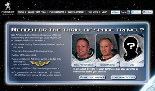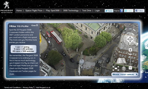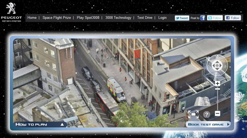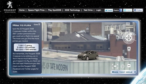 這項令人不敢置信的「太空之旅」,是由英國Peugeot汽車在網路上所推出的「找車子!抽獎上太空」的超勁爆活動,而此活動的最大獎項就是能夠搭著特殊飛行器,前往距離地表100公里處的太空,實際體驗當「太空人」的樂趣,只要網友們登上Spot3008.com的官網,即能進入遊戲的畫面。而這項「找車子!抽獎上太空」的遊戲活動,顧名思義的就是在地圖之中尋找出Peugeot 3008 Crossover車款的藏身位置(利用滑鼠與shift及ctrl按鍵控制方向和距離),只要找出共20部3008 Crossover車款就能獲得參加「太空之旅」的抽獎機會。另外,為了幫助網友們找尋車子,車廠也會定期在Peugeot 3008 Facebook與Twitter的網頁中發布車輛位置的相關提示。