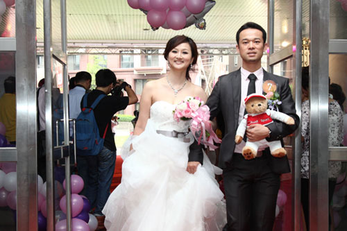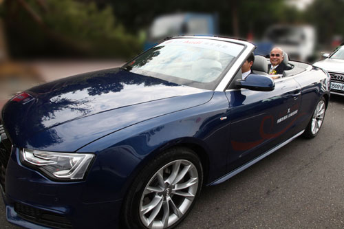 Audi豪華婚禮車隊由台積電人力資源副總杜隆欽賢伉儷領銜出場,搭乘Audi 旗下最新A5 Cabriolet頂級豪華敞篷跑車帶領25對新人依序入場,帥氣拉風的A5 Cabriolet敞篷車甫亮相立刻吸引現場許多媒體、台積電員工以及觀禮家屬們簇擁拍照,現場鎂光燈閃爍不停,吸睛指數百分百!除此之外,搭乘Audi豪華禮車的新人們興奮之餘也都感受到無比尊榮,同時也對Audi豪華禮車的舒適性和安全性讚譽有加,不少新娘手拿捧花,新郎抱著Audi原廠精品泰迪熊布偶,高喊「乘坐Audi豪華房車結婚完成終身大事,我們真的好幸福唷!」