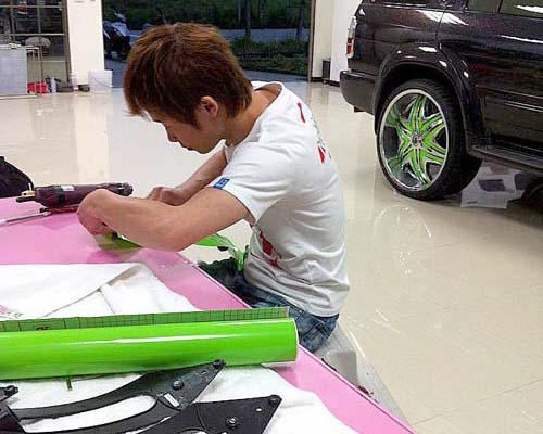 | F1國際車體美學歐帝 先生達人貼膜甘苦談:這樣的大型休旅車在施工上,確實有其困難度,除了尺寸、高度上需要人手幫忙之外,為了滿足大而細緻的要求,許多收邊細節更需要耗費不少心血完成,因為鈑件空間有限的關係,許多細節部分經過與車主的往來討論,最後才確定下來,這或許不是很複雜的工程,但卻能製造出獨特的視覺感受,相信這將會是大家所喜愛的感覺! |