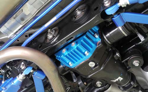 賽道等高運動量走行時,原廠差速器油殼的納油量不足問題得到改善,這組Cusco推出的加大油殼能多提供原廠將近一半以上的納油量,另外鋁合金切削材質的採用在撞風時更能快速降溫,令內部油品保持常溫,提供LSD最佳的潤滑效率,再來內部特殊的紋路設計更能對應高側G時,讓油品能有效進入LSD內部進行潤滑的功用。