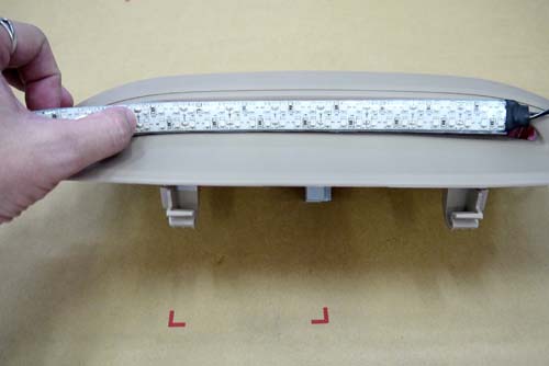 拆下燈泡後,先將LED燈條電源線頭進行剝皮約1公分即可,將兩條電線分別穿過已燒損的第三煞車燈泡底下的原有電力輸入來源端,透過這樣的方式取得驅動發光的電力來源,可省去另外撥線皮接電的手續,這也是為何我們需要已燒損的第三煞車燈泡原因。穿過後將燈條線組纏緊即可,接續將燈泡裝回原有燈座上,並裝回第三煞車燈具總成內。再來我們可先量測一下我們所需的LED燈條長度,大多數產品尺寸約為30~40公分左右,但我們可依照燈具寬度,減去多餘的燈條長度,稍加整理其線組後,便可將LED燈條撕去背面雙面膠保護層,貼附在適當位置,並依照原先拆卸燈具順序,反向將燈具、線組裝回,測試確認發光正常,一切就算大功告成!倘若裝回後測試,燈條並未正常發光作動,首先,請先確認是否燈條接電的線組是否確實纏繞完整,其線組是否有夾傷破皮發生,假定都沒有這些問題,那就是我們必須將燈條線組與燈泡纏繞的地分進行交換,因為LED燈條有所謂的正、負電極區分,鎢絲燈泡卻沒有這樣的差別,因此,將此處進行更換後,應當一切就都沒問題了!