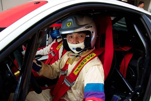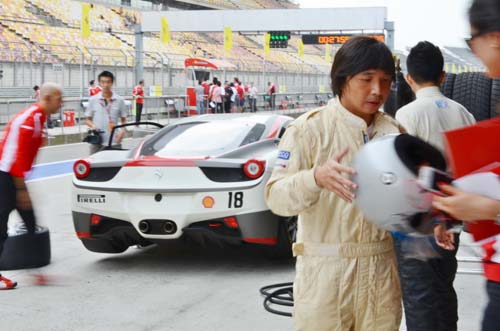 此次試駕只有五個名額,中國三位、香港一位及台灣一位,在基本的車輛介紹與說明後,簡報在沒有任何問題的情況下結束了,看起來大家都非常急著想開到458 Challenge。第一輪先進行賽道體驗,看著在第一位上場的香港記者鑽進車內,工作人員幫他將無線電的線頭插上安全帽的接頭,再來將五點式安全帶拉緊,過程就跟賽事畫面完全相同,這時仍有點不敢相信接下來就輪到我了。戴上了安全帽,看著一部部全速衝刺的458 Challenge從大直線呼嘯而過(此時正進行第2次的賽前練習),已經不知道是因為過於緊張或天氣太熱的關係,全身一直在冒汗,這時剛剛的白色458 Challenge已經回到Pit並停在面前,沒有人告訴我接下來該怎麼做,但身體很自然的往前移動並鑽進車內,直到對講機傳來Mediani打招呼的聲音才回過神來,我來自台灣,很高興認識你並有這次的機會,一點頭,車子開始往前動了起來。