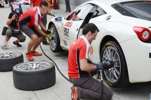 | 經過連續10圈的賽道體驗後,這部加裝了乘客座的458 Challenge因應接下來的試駕而換上一套新胎。 |
