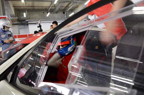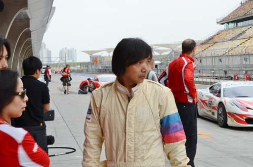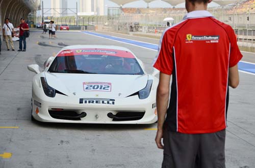 在活動前的星期五我們抵達了賽車場,試駕458 Challenge雖然只是此次行程的其中一項,但對我來說卻是最重要的任務,即便過去已在上海賽道開過車,出發前也針對458 Challenge與上海賽道做足了功課,不斷看著網路上的影像,記住每個彎的檔位及煞車點,但賽車跟量產車之間畢竟仍有著非常大的差異,當實際下場時我真的能夠駕馭458 Challenge的強大速度嗎?它會聽命於我的指令嗎?許多不確定的因素持續在腦海打轉。站在Pit區前,一部部458 Italia忙碌的載著車主進進出出,當時正進行賽道Hot Lap體驗活動,看著每位乘客下車時一臉的滿足笑容,這時我開始莫名的緊張了起來,因為等一下就輪到我上場了,心想這樣的窮緊張也不是辦法,乾脆去458 Challenge的車庫看看賽車技師在做些什麼,沒兩步就看到臺灣蒙地拿服務部經理Tony與車隊工作人員正在為兩部台灣車手的458 Challenge賽車進行整備。