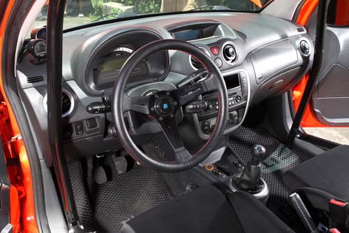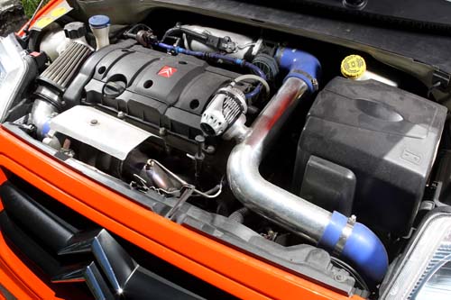 另外一部暱稱「小橘」的暴力改裝Citroen C2 1.6 Turbo,全車用上最頂級的好料配備,光是TU5JP4引擎腹內進行鍛造施工就羨煞不少車友,在引擎體質強化之後,此車最高可承受至1.6bar增壓值,曾經實測100~200km/h加速時間為11秒,連BMW 335i等車款都不是對手。除此之外,外觀特別施以R2式樣彩繪,並針對輪拱施以爆龜處理,因此可容納215/40R17尺寸跑胎,視覺效果也格外突出。