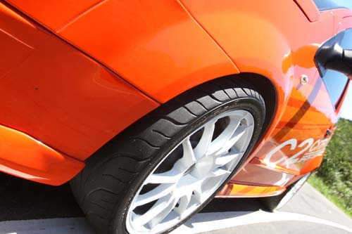 | 輪拱爆龜使外觀感覺更有氣勢,輪胎尺寸更是來到215/40R17,輔以AP四活塞煞車組,碟盤直徑330mm。 |