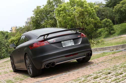 | 圓潤的車尾一直是TT最令人難忘的設計,而底下雙邊四出排氣管正好可與基本款作區隔,其上車主換裝的尾翼則是用來增加高速行駛車尾下壓力之用。 |