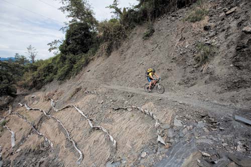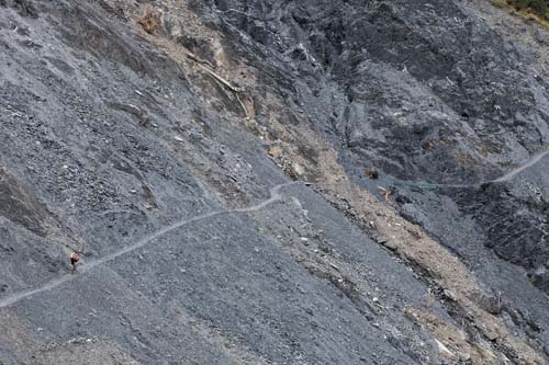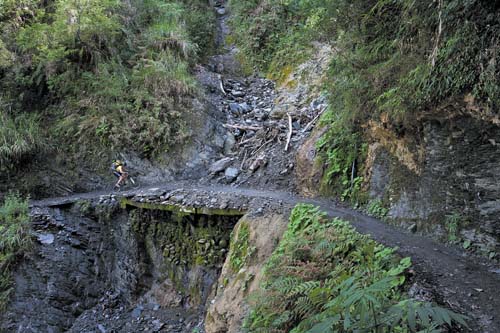 在即將抵達6公里處之前會經過一處大崩壁,遠看十分壯觀,走近之後令人望而生畏,這段地形幾乎逢雨必坍,大片的黑色碎石坡傾瀉而下,而且範圍頗大,要穿越長達數百公尺的崩坍地最好中途不要逗留,行走期間不時可聽到細碎的落滾動聲響。此處雖然沿著山腰開闢出寬約一公尺多的路徑,但只要一陣大雨過後這路徑隨時都會消失。這段崩壁地形上的路徑其實是一大段的陡上坡以及陡下坡,路面破碎難騎,上坡難度高,推車不會比較慢,而下坡得小心滑胎失控,雖然可以騎,但步道緊臨斷崖深淵,而且崩坍範圍相當大,考驗騎士的操控技巧以及心臟強度,若無把握還是推車通過較保險。