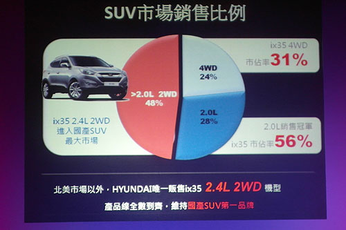 ix35甫上市隨即成焦點,挾帶著新世代的流體雕塑外形,高科技前衛的頂級配備,極高的C/P值。但是在國產SUV最大市場區塊卻是在2WD車款,市場規模每月1,300,佔SUV市場約48%。現代汽車順應廣大費者需求,於是ix35 2.4L 2WD來了。