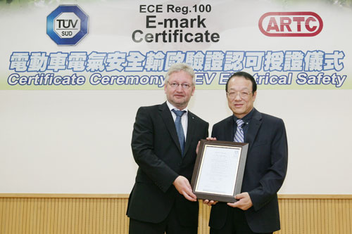 車輛中心為提供業者更加完善的電動車測試驗證能量與外銷驗證服務,硬體上除了陸續建構各項電氣安全防護驗證設備外,人才軟實力面亦於2011年10月與TÜV SÜD共同簽署MOU相互交流,並派員前往德國參與實務訓練;且今年8月,德國專家亦親自來台評鑑,並於9月14日所舉辦的「2012電動車電氣安全驗證技術研討會」上,由TÜV SÜD全球電動車最高主管Mr. Volker Blandow親自頒授予車輛中心ECE R100(電動車電氣安全)輸歐驗證認可證書,同時這也是TÜV SÜD於德國本土外所發出的第一張此項證書。