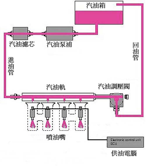 | 圖為供油系統的簡略架構圖,可以發現供油系統主要是由:油箱、汽油泵浦、進油管、油軌、噴油嘴、汽油壓力調整器與回油管所組成。 |