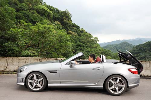 在路邊用力下油門出發,開篷之後V8引擎所發出的瘋狂怒吼讓車上的兩人都嚇了一跳,油門的反應比剛剛在快速道路上變得更為敏銳,少了車頂與車窗的阻隔,V8引擎飽滿誇張的聲響更是直衝腦門,進彎、收油、退檔,再加速,在AMG的狂力下非得快速完成不可,駕駛時完全沒有多餘的思考時間,僅能順著直覺操作,因為下個彎角逼近的速度,遠比想像來得快速。在通過一串彎道之後,總算是習慣了SLK55 AMG的狂力與轉向特性,這具自然進氣V8引擎有著瘋狂卻是悅耳的聲浪,不過也為車頭帶來一些重量,入彎時得好好對準路線,否則SLK55 AMG就會在彎裡出現彆扭的動態而錯過出彎加油的時機,但只要抓準動線,角度對準、車頭擺正時狠狠踩下油門,伴著狂嚎而來的推力與行雲流水的過程絕對會讓人大呼過癮。