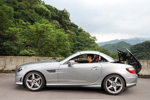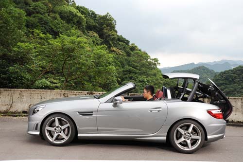 SLK 55 AMG的一大特徵是採用雙片式電動折疊敞篷,這樣裝置可在時速7km/h以下做動,做動的時間需時20秒,僅需一個紅綠燈的停車時間,就可以在開關篷間自由切換。以現在的技術來說,電動硬頂敞篷已經是相當普遍的配置,但M.Benz還繼續在電動硬頂上追加新的功能,以帶給車主更多地享受。名為Magic Sky Control的可變採光車頂是SLK55 AMG的選用配備,它也出現在我們的試乘車上。Magic Sky Control藉著在玻璃夾層中注入電磁控制分子,進一步改變玻璃的透光性,僅需按下按鈕,玻璃就可在透明與深色間切換自如,讓敞篷車也能享受玻璃天窗的樂趣;當然,Magic Sky Control是選用配備,原本的配備僅是深色染色車頂而已。開篷、深色車頂、淺色車頂,三種不同的選擇,在SLK55 AMG車上看來是如此的理所當然,不過在以前這樣的配備可是難以想像。